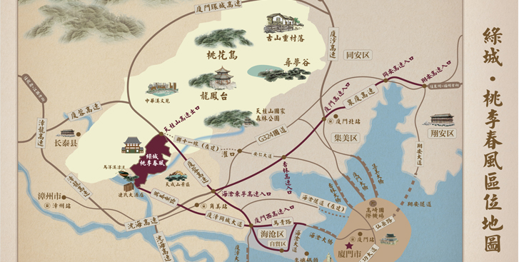 桃李春风依山傍水,倡导“产城”融合概念,规划两心、四园、八大核心功能,涵盖中西式院墅、生态公寓、金融产业服务平台、创意办公、温泉酒店、小镇中心等多种业态。