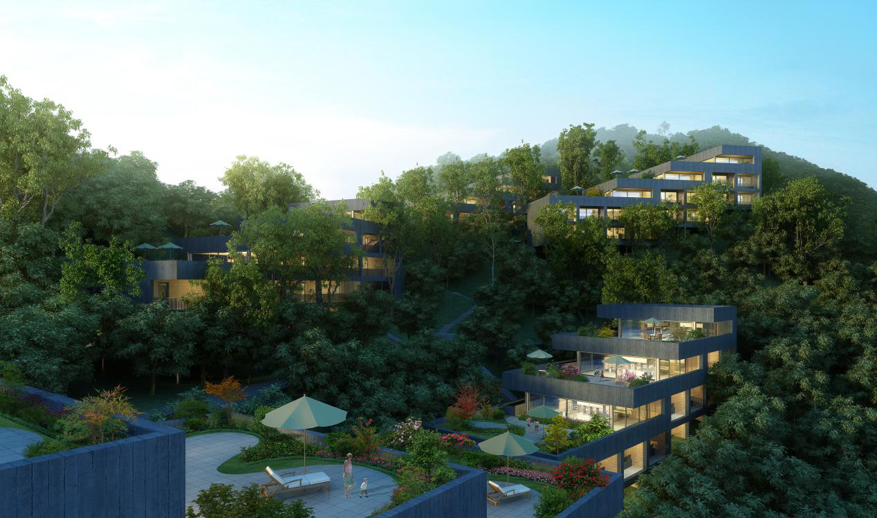 延请芬兰Viiri设计事务所,主创设计首批墅式观山酒店,采用现代北欧建筑的极简手法,顺山体通过层层退台将体量削减,使建筑隐于山林之间。同时所有户型均采用大面积玻璃落地窗设计,以求最大限度让居者融入自然,营造出与自然同呼吸的美好。